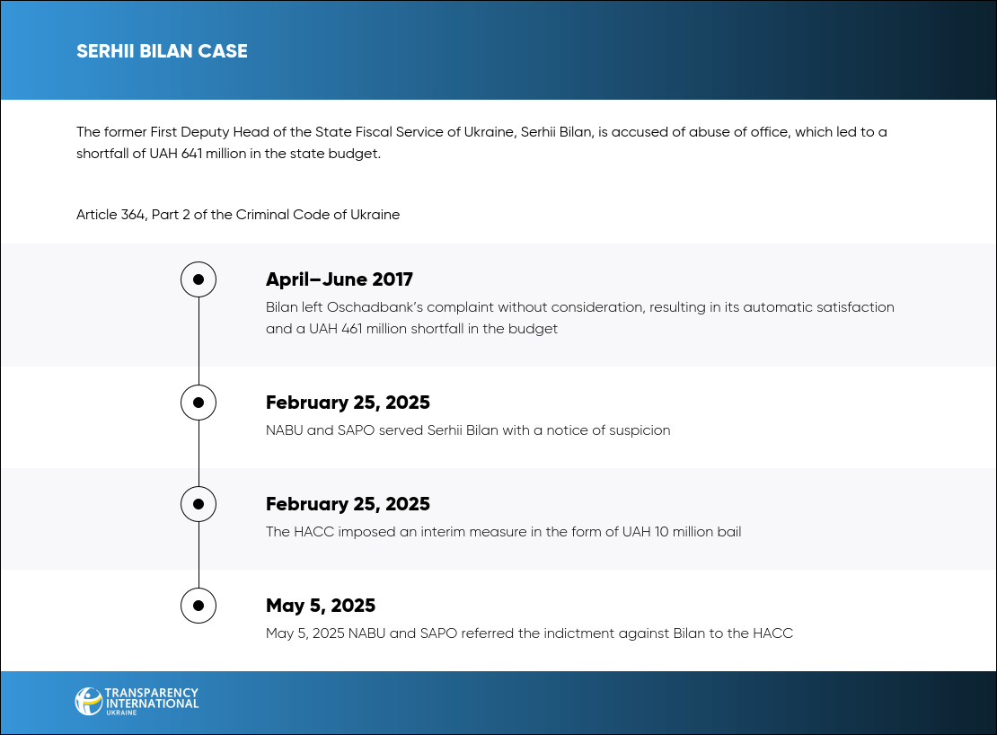 According to NABU and SAPO, Bilan deliberately created the appearance of being unable to sign such a decision. However, in reality, he was the only authorized official at the SFS of Ukraine to sign decisions following the review of complaints from large taxpayers.