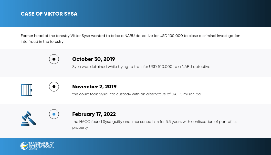 On February 17, 2022, the HACC found Viktor Sysa, the former head of the Hutia forestry, guilty of trying to bribe a NABU detective to close the proceedings on fraud in the forestry. Sysa was sentenced to 5.5 years.