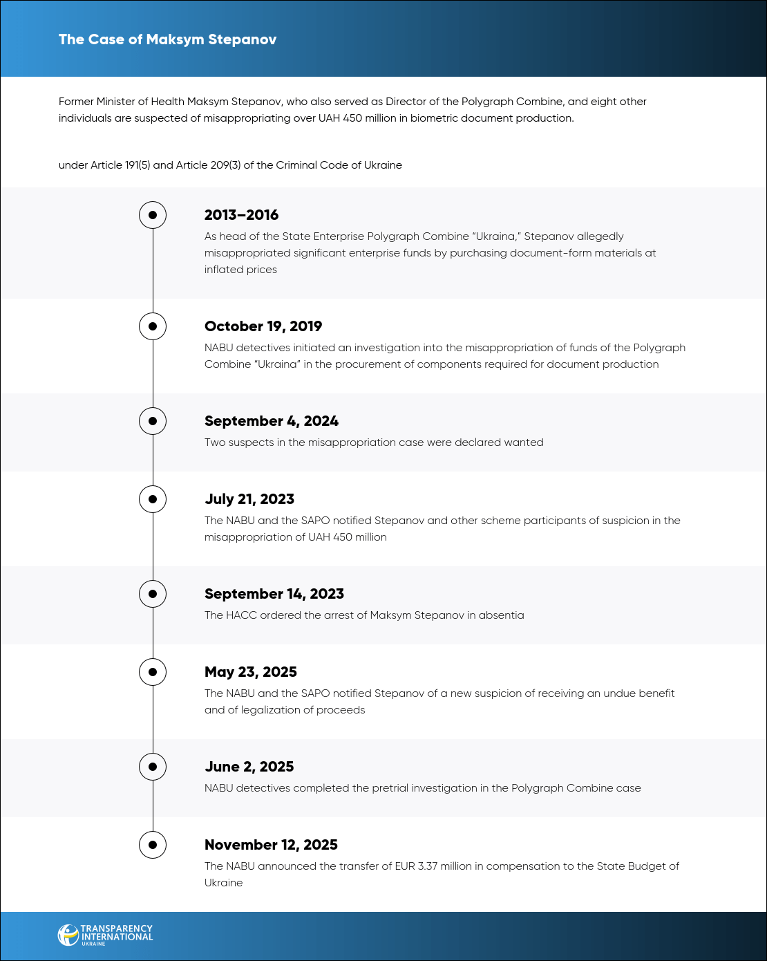 The NABU and the SAPO suspect former officials of the state-owned Polygraph Combine “Ukraina” of misappropriating over UAH 450 million in the production of biometric documents. Among the suspects is former Minister of Health Maksym Stepanov, who served as Director of the Polygraph Combine during the years when the scheme operated.