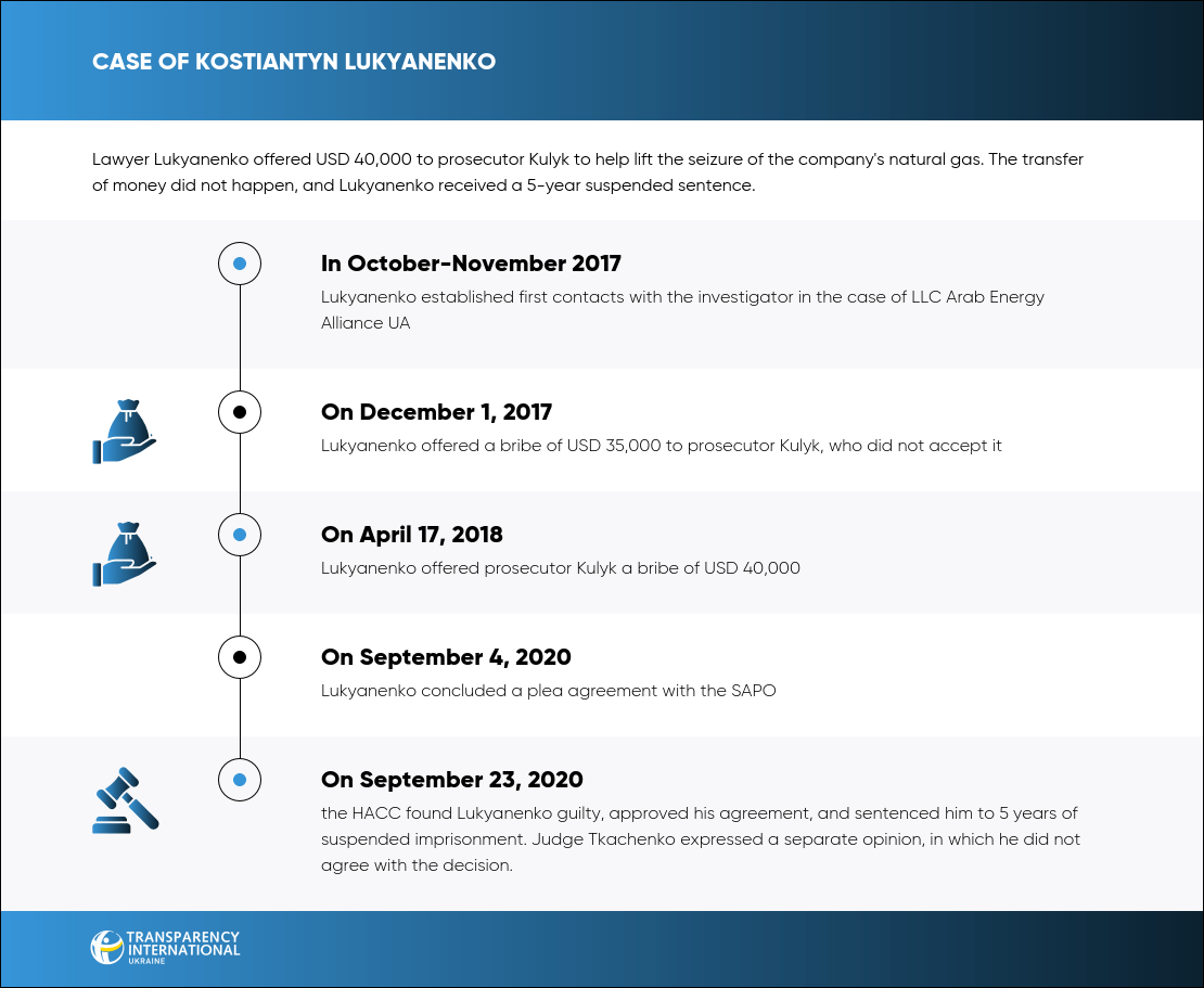 On September 23, 2020, the HACC found lawyer Kostiantyn Lukyanenko guilty of offering the Prosecutor General's Office a bribe of USD 40,000 for assistance in lifting the seizure of part of the company's natural gas. Based on the agreement with the SAPO prosecutor, Lukyanenko was given 5 years of suspended sentence with a probationary period of 3 years.