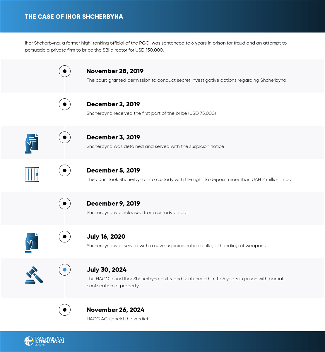 The HACC convicted Ihor Shcherbyna, former head of the Main Investigative Department of the Prosecutor General's Office, for fraud, incitement to bribery, and unlawful handling of weapons. He was imprisoned for 6 years with confiscation of property.