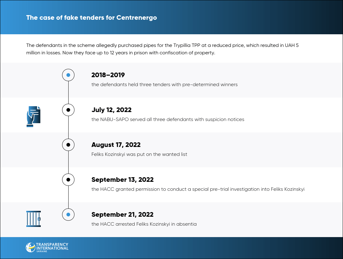 According to the investigation, in 2018–2019, Volodymyr Ivarovskyi, who was then the head of the material and technical supply department of PJSC Centrenergo, together with Denys Yampolskyi, who was the deputy director of the Trypillia TPP, held a tender for the purchase of pipes with a predetermined winner.