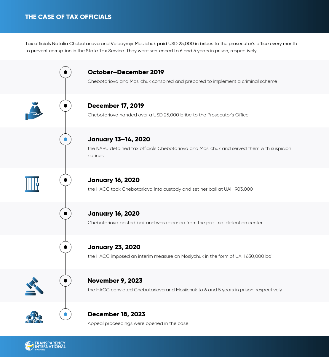 Chebotariova and Mosiichuk were charged with Article 369, part 3 of the Criminal Code of Ukraine. The tax official was sentenced to 6 years in prison with confiscation of property and a ban on holding certain positions for 3 years. Her deputy was sentenced to 5 years in prison with identical additional penalties.
