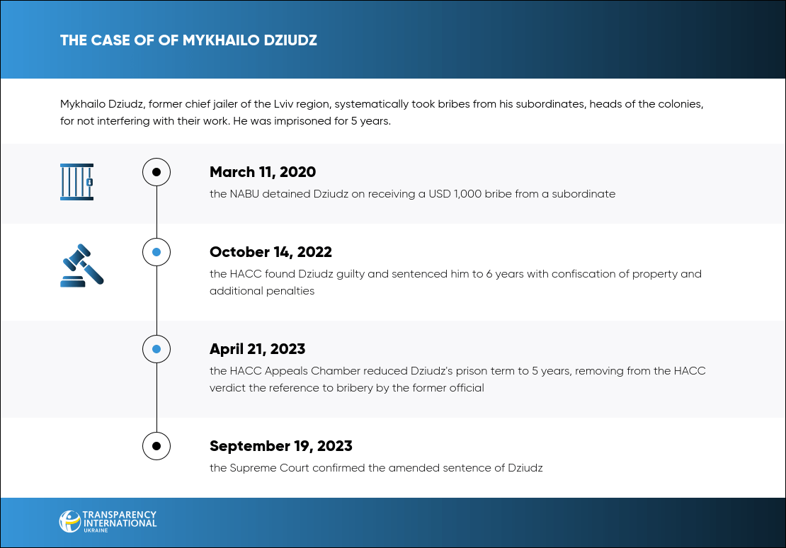 On October 14, 2022, the HACC convicted Mykhailo Dziudz, former head of the Lviv Regional Penitentiary Service and a member of the Lviv Regional Council, of systematically demanding and receiving bribes from his subordinates for not interfering with their work.