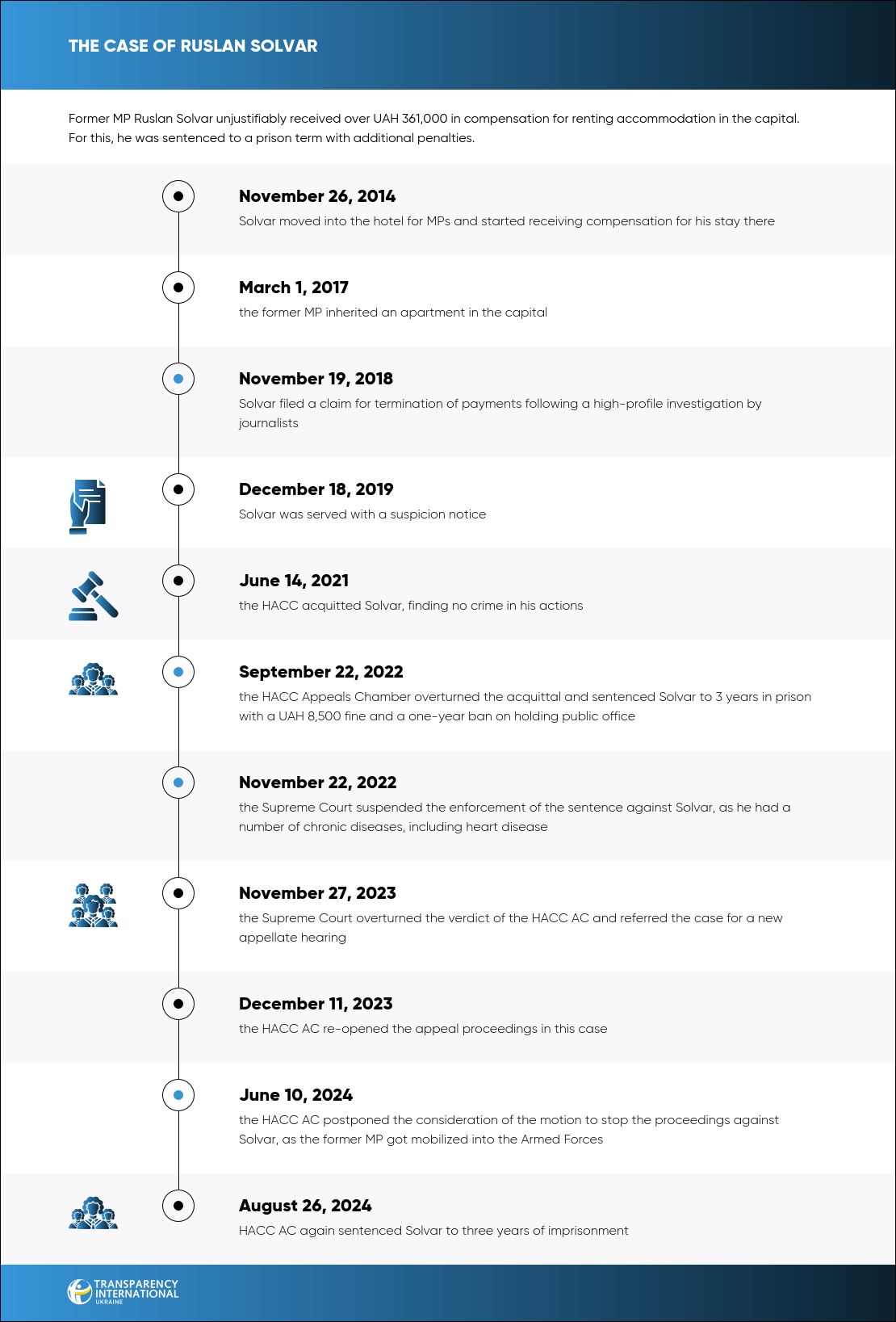 It was reported that in June 2024, Solvar mobilized into the Armed Forces. In late August of the same year, the panel of HACC AC judges, consisting of Mykhailenko, Pavlyshyn, and Nykyforov again found former MP Solvar guilty. He was sentenced to 3 years in prison.