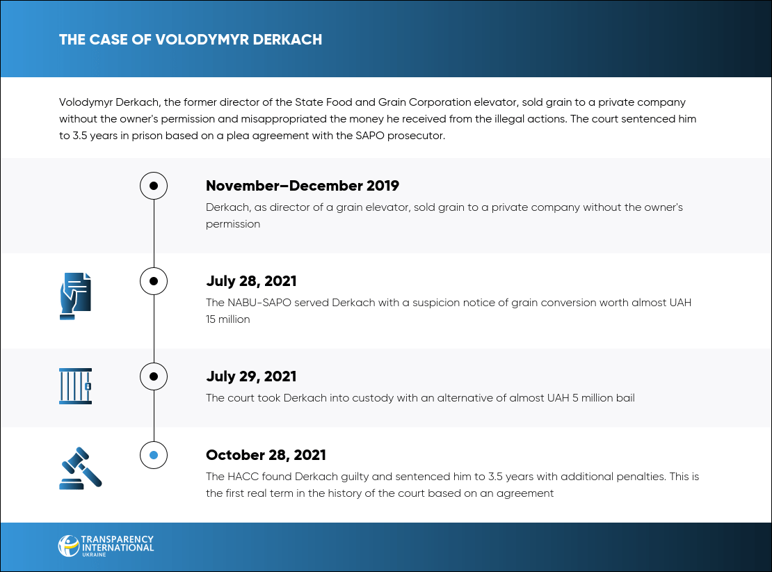 On October 28, 2021, the HACC found Volodymyr Derkach, the former director of the branch of JSC State Food and Grain Corporation of Ukraine, guilty of taking possession of state grain worth almost UAH 15 million. Derkach was sentenced to 3.5 years in prison.