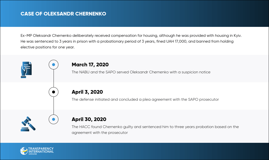 On April 30, 2020, the HACC found Oleksandr Chernenko, ex-MP from the Petro Poroshenko Bloc, guilty of unreasonably obtaining compensation for housing. The accused and the prosecutor concluded a plea agreement, so the ex-MP was sentenced to probation for a year.