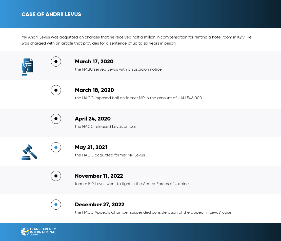 On May 21, 2015, the HACC acquitted former MP Andrii Levus. He was accused of illegally receiving more than half a million hryvnias in compensation for renting an apartment in Kyiv, although he allegedly had a place to live.