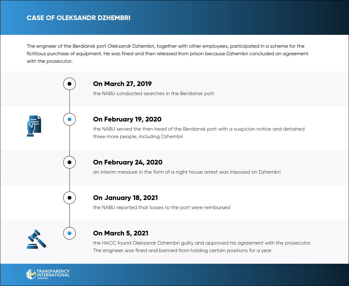 On March 5, 2021, the HACC found engineer Oleksandr Dzhembri guilty as an accomplice in the case of damages to the Berdiansk port. Based on the agreement, he was given a suspended sentence of 3 years in prison with a fine of UAH 8,500 and deprivation of the right to hold certain positions for 1 year 6 months.