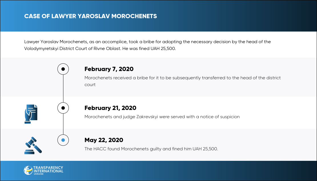 On May 22, 2020, the HACC found Rivne lawyer Yaroslav Morochenets guilty that he, as an accomplice, took a bribe for adopting the necessary decision; the funds were to be transferred to the head of the Volodymyretskyi District Court of Rivne Oblast. The lawyer was fined for this.