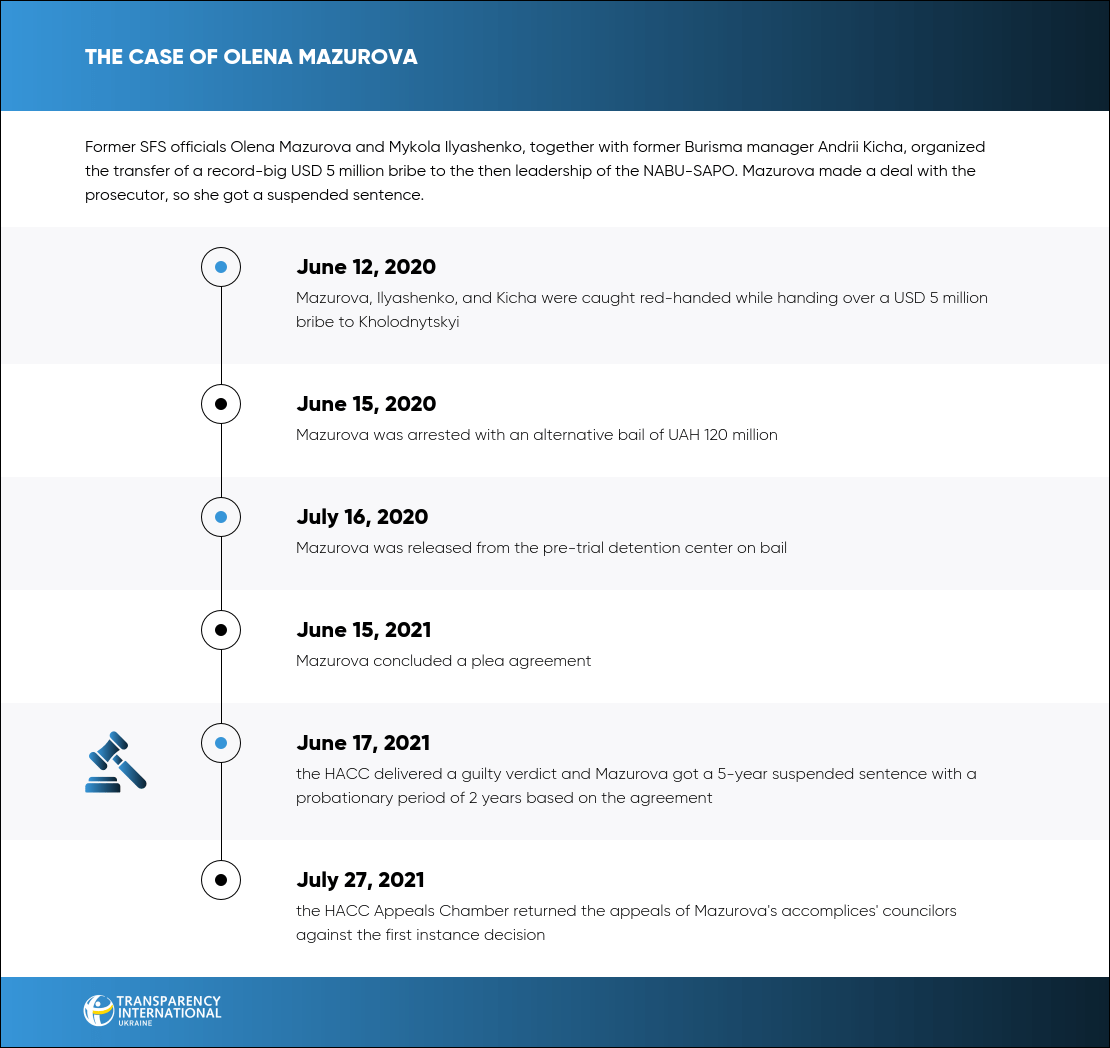 On June 17, 2021, the HACC found Olena Mazurova, the former head of an SFS department, guilty of bribing the leadership of the NABU and the SAPO and being an accomplice to close the proceedings against former Minister of Ecology Zlochevskyi. For this, she received probation because she had concluded a plea agreement with the prosecutor.