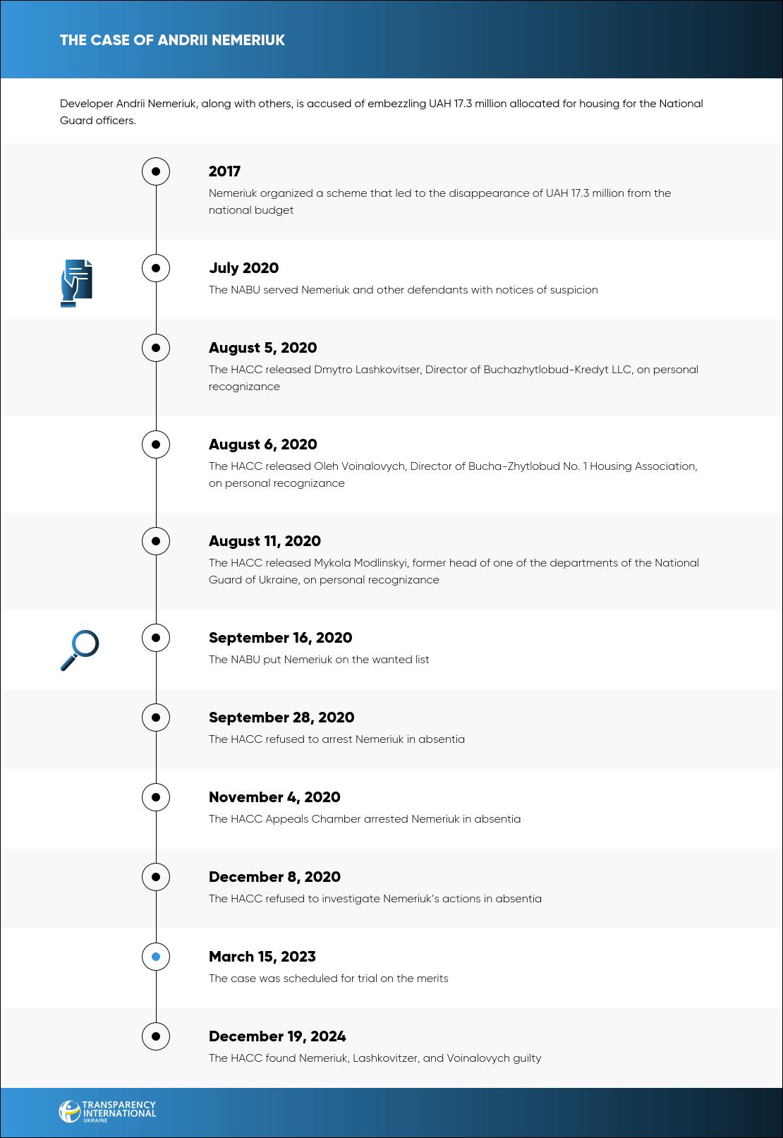 The HACC approved the agreement and sentenced Nemeriuk to 5 years of suspended imprisonment with a 3-year probationary period. He was also banned from holding certain positions for 1 year. Lashkovitzer and Voinalovych received similar sentences — 5 years of suspended imprisonment with a 3-year probationary period.