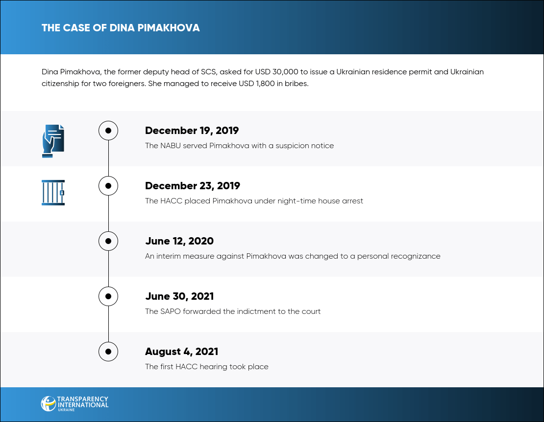 Information about the operational work of Pimakhova’s acquaintance and the NABU was subsequently leaked, and the process of illegal document issuance for foreigners was accordingly never completed. In November 2017, the media reported that the SSU and the Prosecutor General’s Office allegedly foiled a special operation by NABU agents at the customs. The SCS, in turn, reported that the NABU agent tried to provoke Pimakhova to take a bribe.