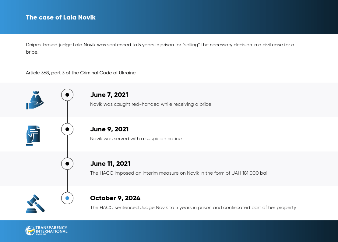 The HACC found judge Lala Novik from Dnipro guilty of receiving a bribe for adopting a decision in the interests of others. She was sentenced to 5 years in prison.