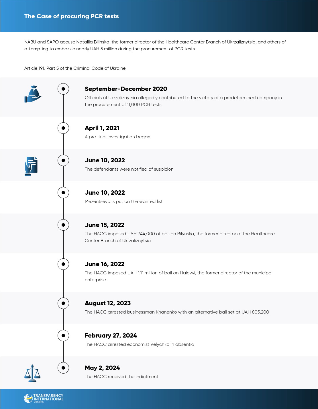According to investigators, Bilinska, along with officials from the Healthcare Center Branch and representatives of Medical Center of Health LLC, organized an attempt to embezzle funds during the procurement of PCR testing services. They altered the technical requirements of the procurement, agreed on inflated service costs, and submitted proposals from companies under their control.
