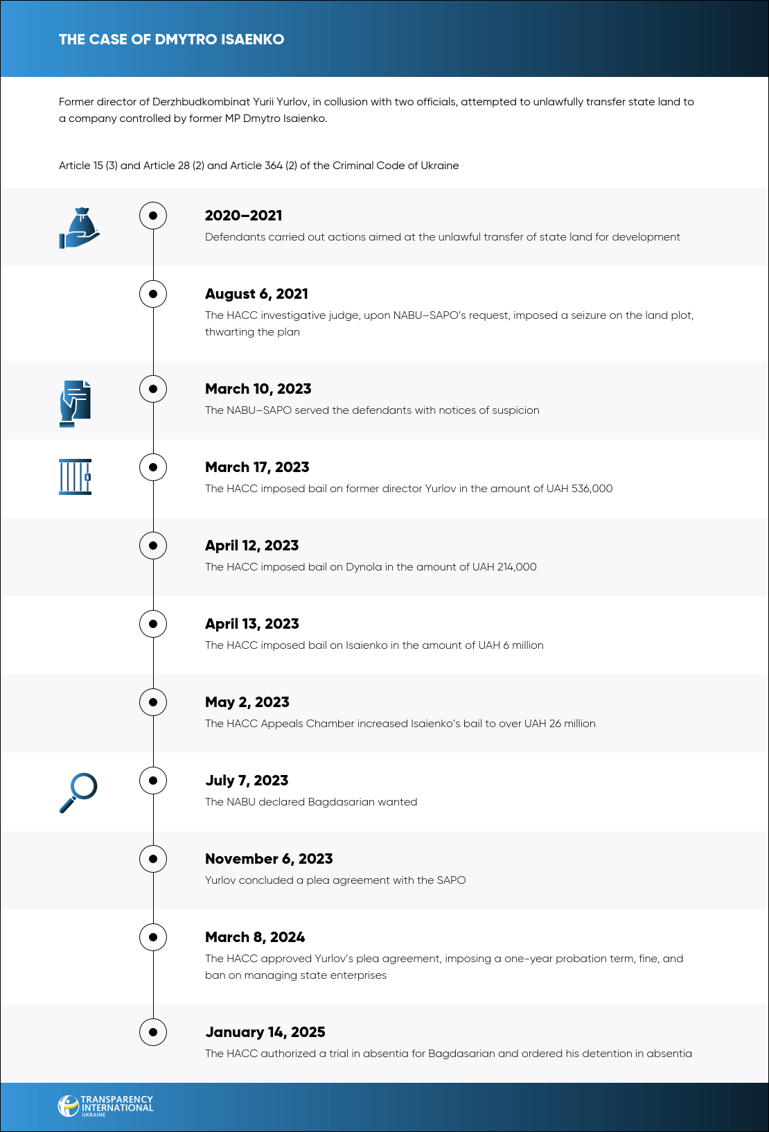 According to the prosecution, in early 2020, Isaienko devised a plan to misappropriate a land occupied by the state enterprise Derzhbudkombinat with the intention of constructing a residential complex on it. To implement this plan, he colluded with Oleh Dynola, then an adviser to the director of the enterprise Yurii Yurlov, and Eduard Bagdasarian, then Deputy Chief of Staff of the Verkhovna Rada of Ukraine (whose portfolio included oversight of the enterprise).