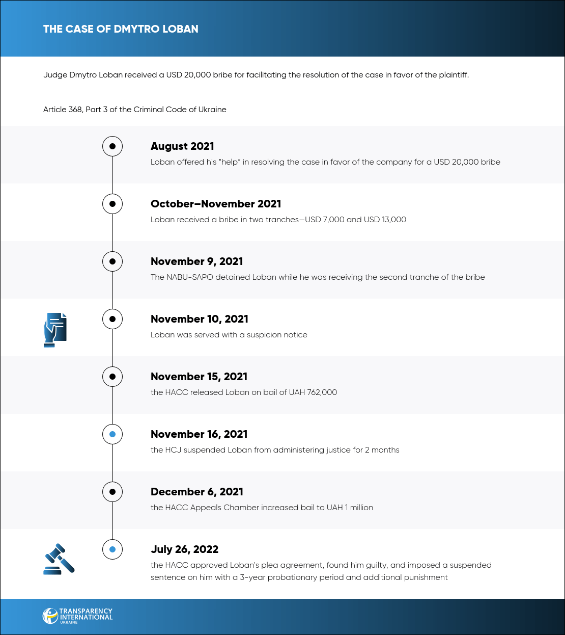 On July 26, 2022, the HACC found Dmytro Loban, a judge of the Chernihiv District Administrative Court, guilty of taking a bribe for a positive decision in the case in favor of the plaintiff. The judges imposed a suspended sentence on him.
