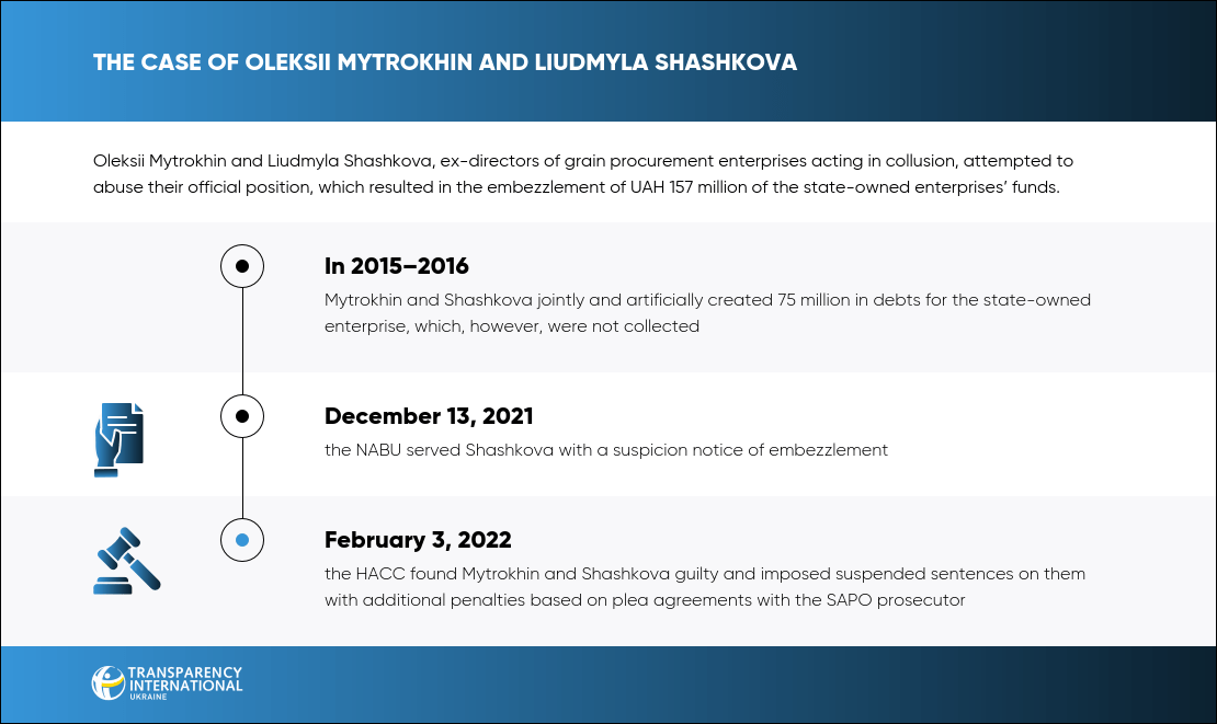 On February 3, 2022, the HACC found Oleksii Mytrokhin and Liudmyla Shashkova, the former heads of grain procurement state-owned enterprises, guilty of attempted abuse of authority that could have led to million-worth embezzlement. They got suspended sentences.