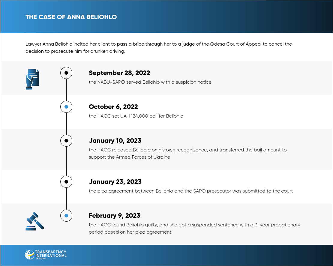 On February 9, 2023, the HACC found lawyer Anna Beliohlo guilty of inciting her client to bribe a judge for a favorable decision in a DUI case. Based on a plea agreement with the prosecutor, she got a suspended sentence with a 3-year probationary period.