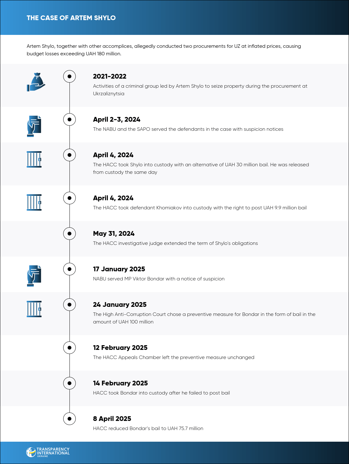 Shylo created a criminal group that included his subordinates, UZ officials, and several other individuals. He initiated a letter to UZ titled “On Threats to National Security,” which served as grounds for rejecting more favourable bids. At the same time, he ignored the Belarusian citizenship of the company’s owner and his links to the Russian Federation. Through an intermediary company in Bulgaria, the “winner” purchased transformers in Uzbekistan and resold them to UZ at nearly double the purchase price.