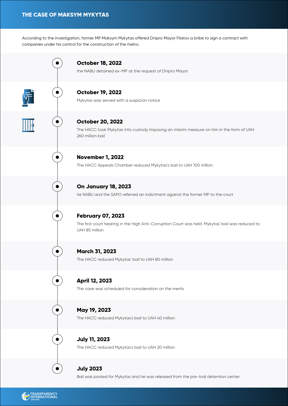 Former MP and developer Maksym Mykytas is accused of attempting to bribe Dnipro Mayor Filatov to sign a metro construction contract with his company without a tender. The amount of the proposed bribe is estimated at a record EUR 22 million.