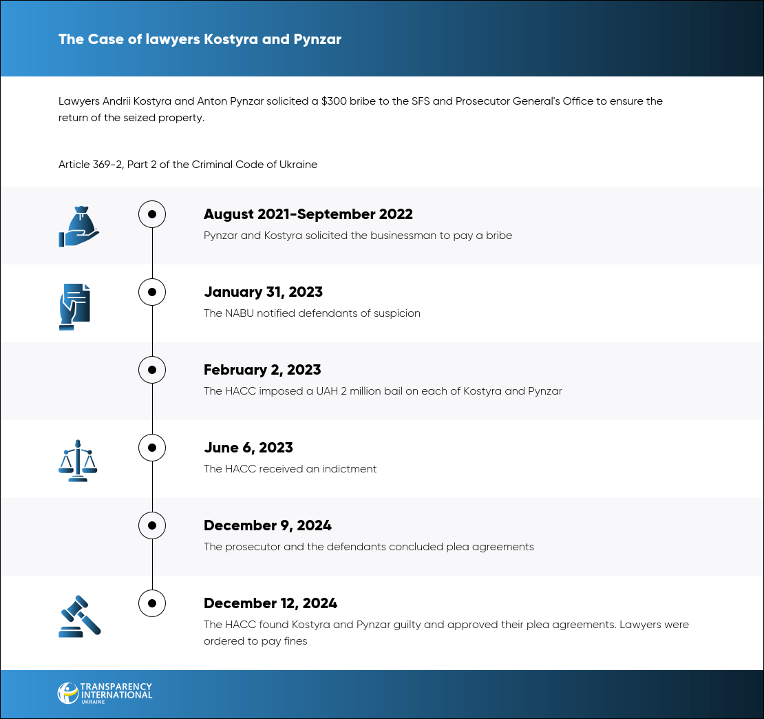The HACC found lawyers Andrii Kostyra and Anton Pynzar guilty of soliciting a $300 bribe to officials of the Prosecutor General's Office and the Fiscal Service.