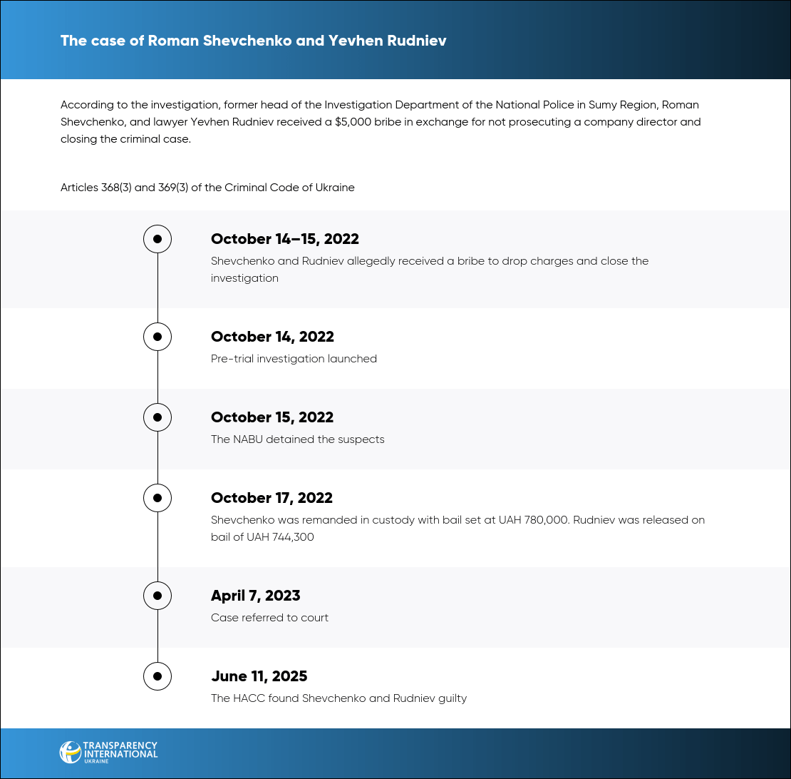 The HACC found the former head of the Investigation Department of the Main Directorate of the National Police in Sumy Region, Roman Shevchenko, and lawyer Yevhen Rudniev guilty of accepting a $5,000 bribe.