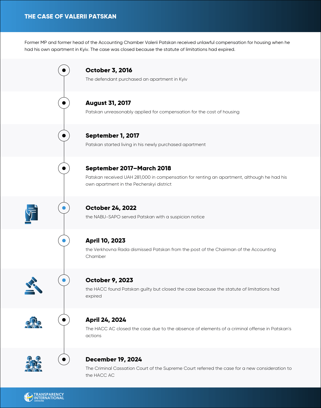 On October 9, 2023, the HACC found Valerii Patskan, former MP and former Chairman of the Accounting Chamber, guilty of illegally receiving compensation for housing. He avoided punishment due to the expiration of the statute of limitations.