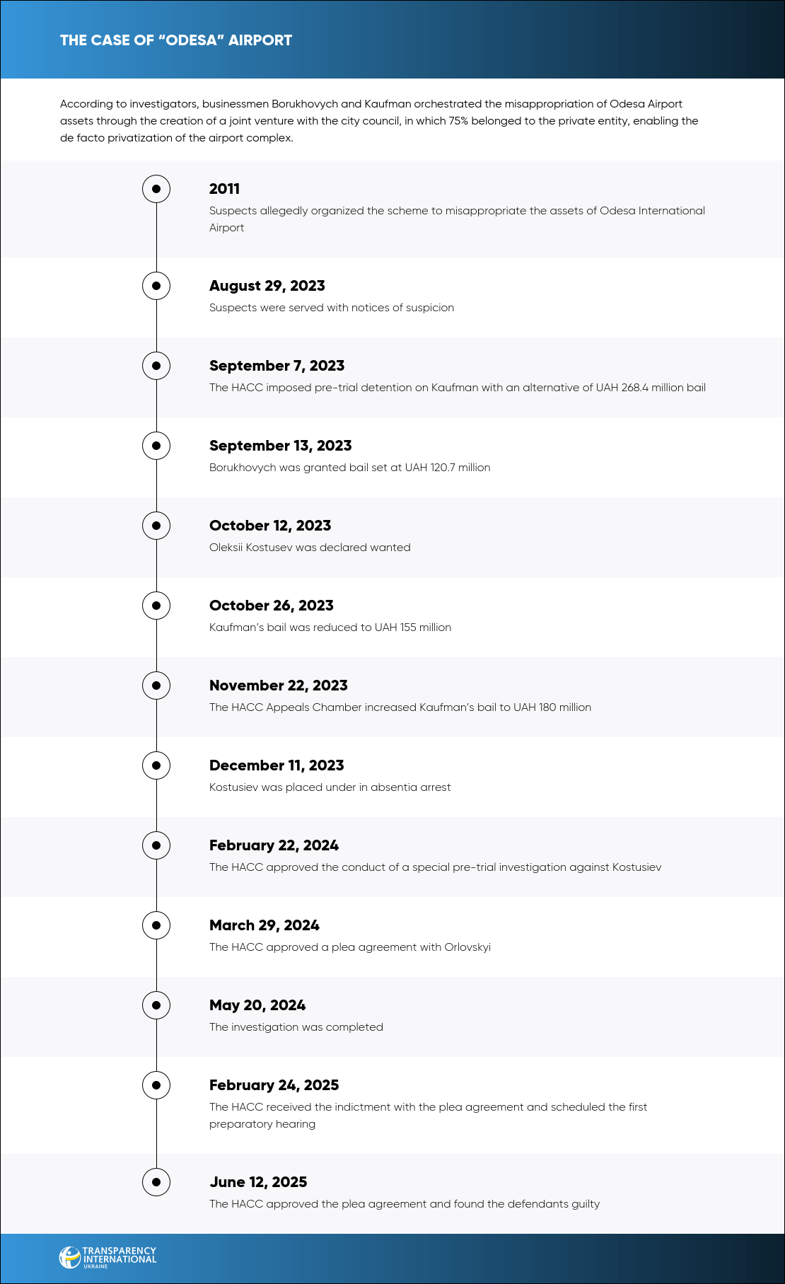 Also, in 2024, the High Anti-Corruption Court approved a plea agreement and found another figure in the case—former acting Deputy Mayor of Odesa Anatolii Orlovskyi—guilty. The court sentenced him to a 3-year probationary period with additional obligations.