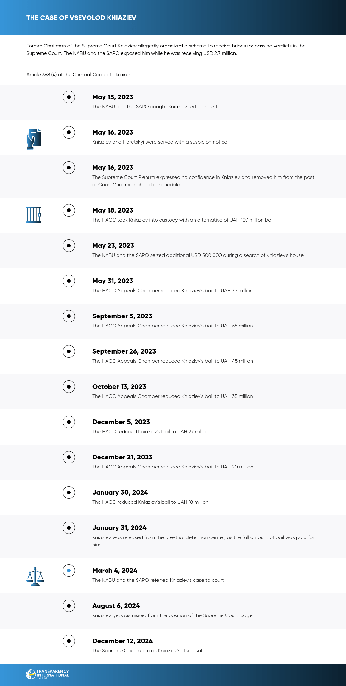 In May 2023, NABU detectives exposed Kniaziev for receiving USD 2.7 million in bribes. According to investigators, Kniaziev, in collusion with notary Kyrylo Horburov and lawyer Oleh Horetskyi, orchestrated a scheme to receive bribes in exchange for favorable court decisions. Horburov was responsible for soliciting clients, while Horetskyi handled negotiations with Kniaziev, who in turn communicated with judges of the Supreme Court.