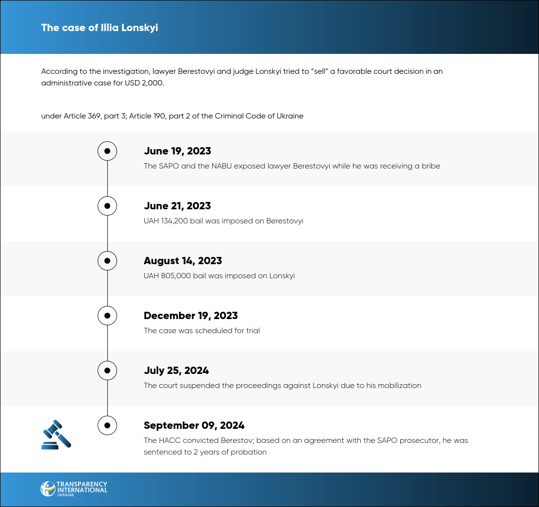 On September 9, 2024, the HACC approved the agreement and found Yevhenii Berestovyi, lawyer and Kherson district council member, guilty of bribery and fraud. Illia Lonskyi, Odesa-based judge, also appears in the case; the proceedings against him have been suspended.