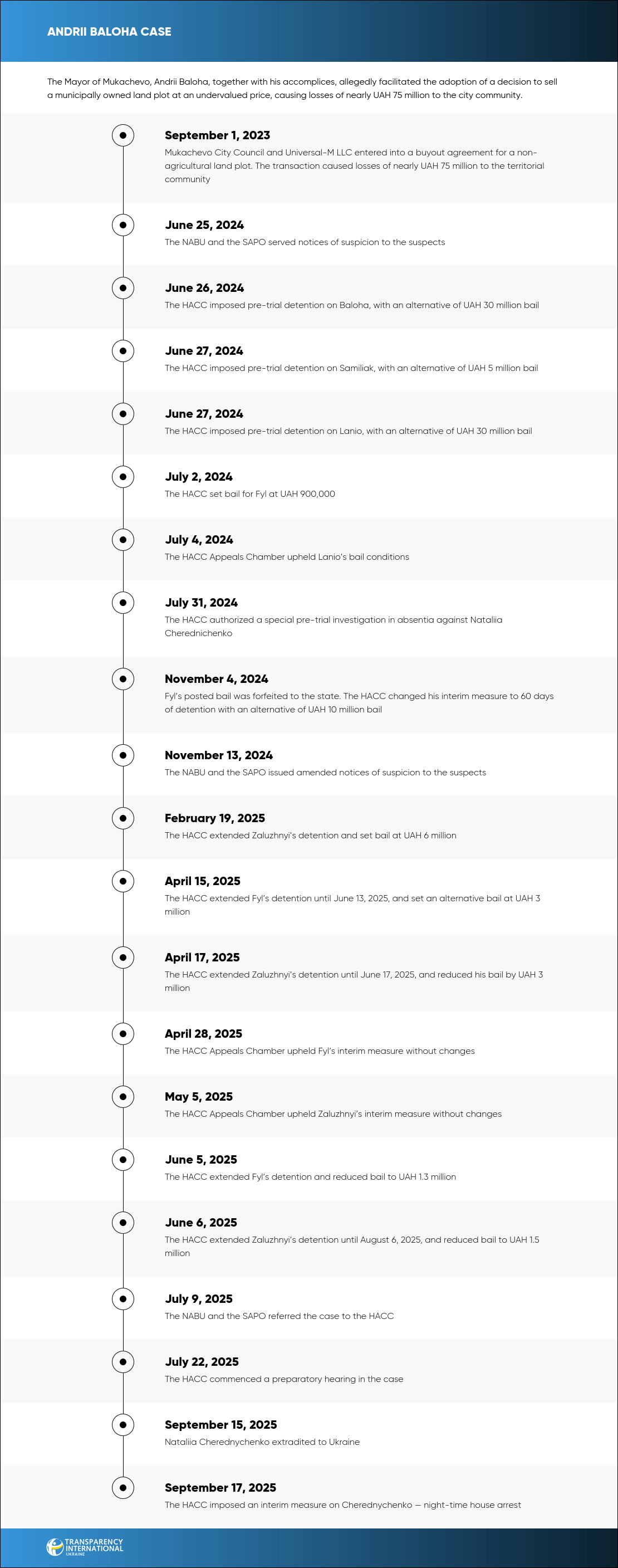 According to the prosecution, Lanio approached Mukachevo Mayor Andrii Baloha to facilitate the purchase of the land under the stadium by Universal-M LLC at a reduced price. The mayor, in turn, ensured that the decision for the sale was passed.