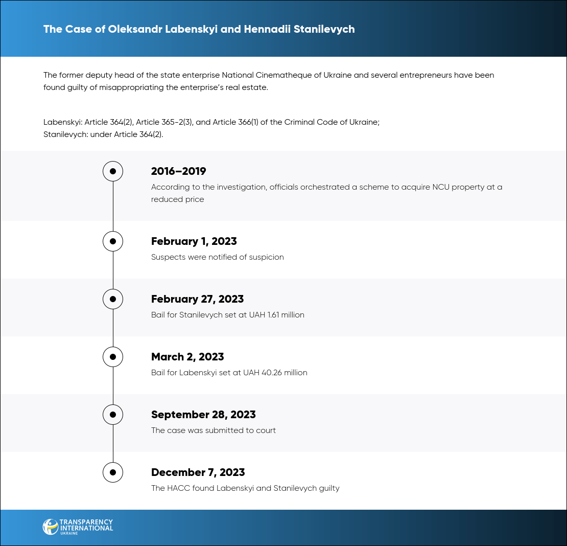 The HACC found owner of Ecosolar Invest LLC, Eurosolar LLC, and West Prite LLC Oleksandr Labenskyi, as well as former First Deputy Director of the state-owned enterprise National Cinematheque of Ukraine Hennadii Stanilevych, guilty of the unlawful acquisition of property belonging to the NCU.