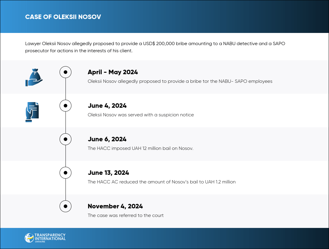 At that time, Nosov was a lawyer in the Miller Law Firm, which represented the interests of Yulia Frolova, chairwoman of the board of the Alliance bank and one of the persons involved in the case regarding the embezzlement of Ukrenergo electric energy and legalization of money obtained through the sale of this energy amounting to UAH 716 million. The improper advantage provided by Nosov entailed that SAPO prosecutors and NABU detectives were to: