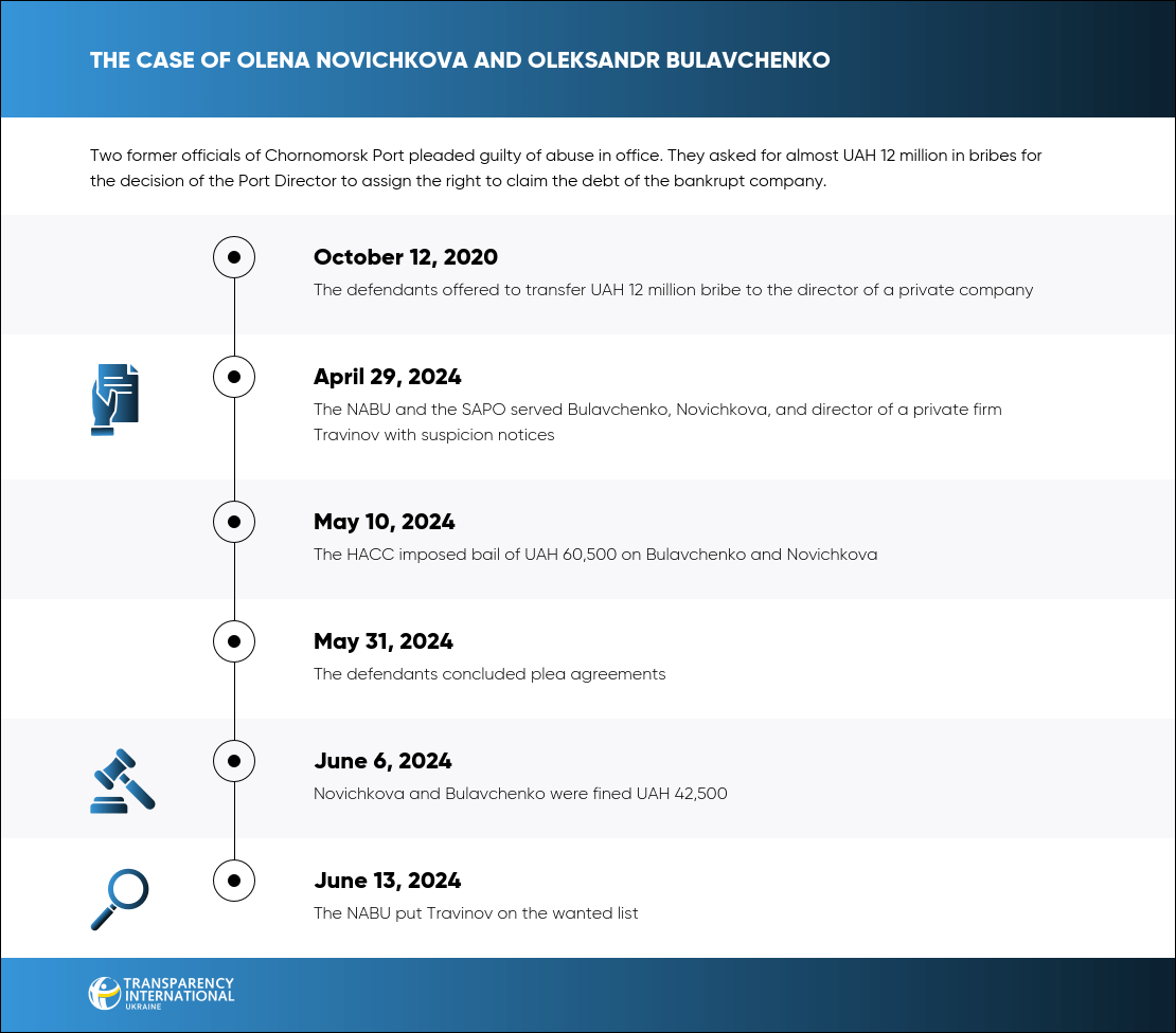 In 2020, Novichkova and Bulavchenko offered Oksana Shubko, director of European Agro Investment Ukraine, to pay USD 424,000 (UAH 12 million) in bribes. For these funds, Novichkova and Bulavchenko promised to ensure the conclusion of an agreement on the assignment of debt claim in favor of another company. To do this, they had to influence the acting port director.