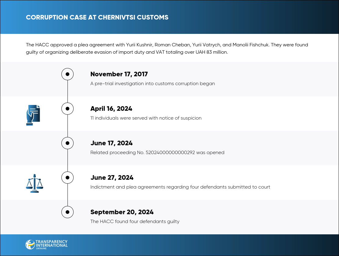 In addition, the case features sanctioned businessman Oleksandr Yerimichuk, former head of Chernivtsi Customs Mykola Salahor, deputy head of the department of this customs office Hennadii Potseluiko, deputy head of the Chernivtsi customs post Mykola Nikulesku, as well as Andrii Remarchuk, Ihor Savka, and Serhii Bilobrytskyi.