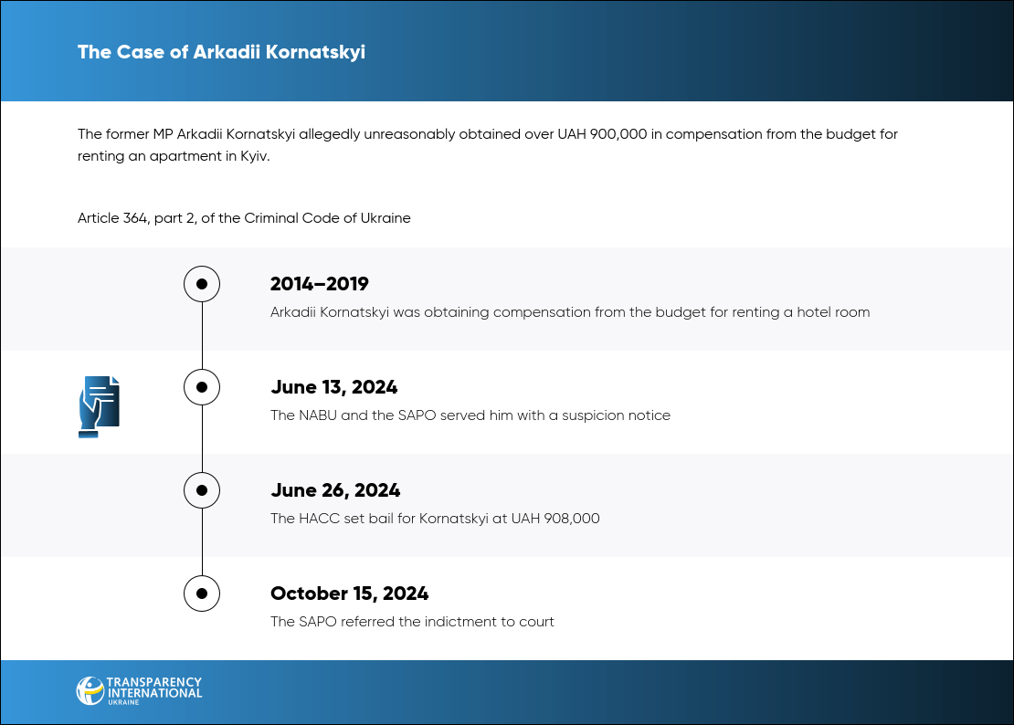 The pre-trial investigation found that between 2014 and 2019, Kornatskyi obtained compensation from the budget for renting the hotel room, despite having property in Kyiv. He concealed the fact of obtaining unjustified UAH 936,000 in compensation from the budget.