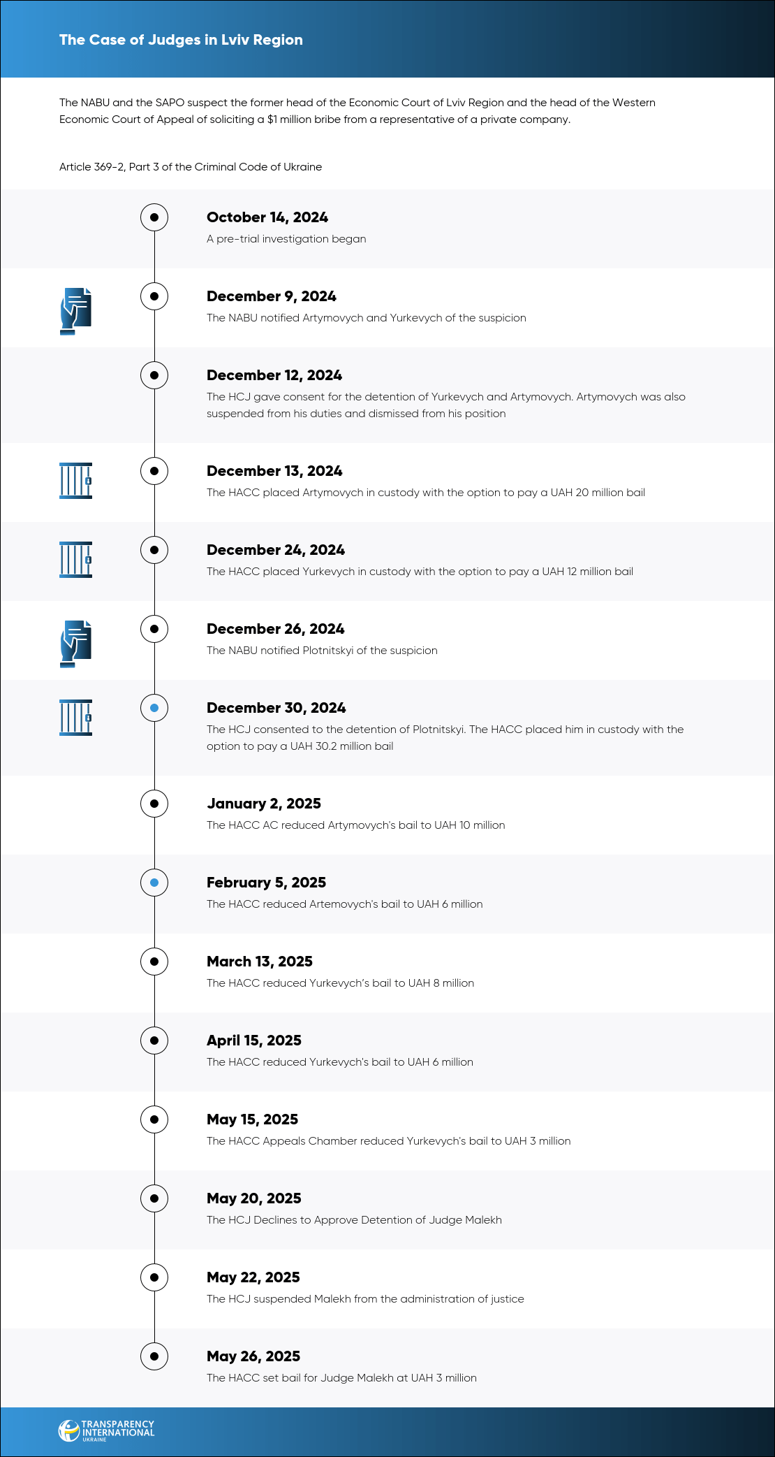 The NABU and the SAPO suspect Vasyl Artymovych and Mykhailo Yurkevych, former heads of the Economic Court of Lviv Region, of soliciting a $1 million bribe from a representative of a private company. Borys Plotnitskyi, the former head of the Western Economic Court of Appeal, also appears in the case.