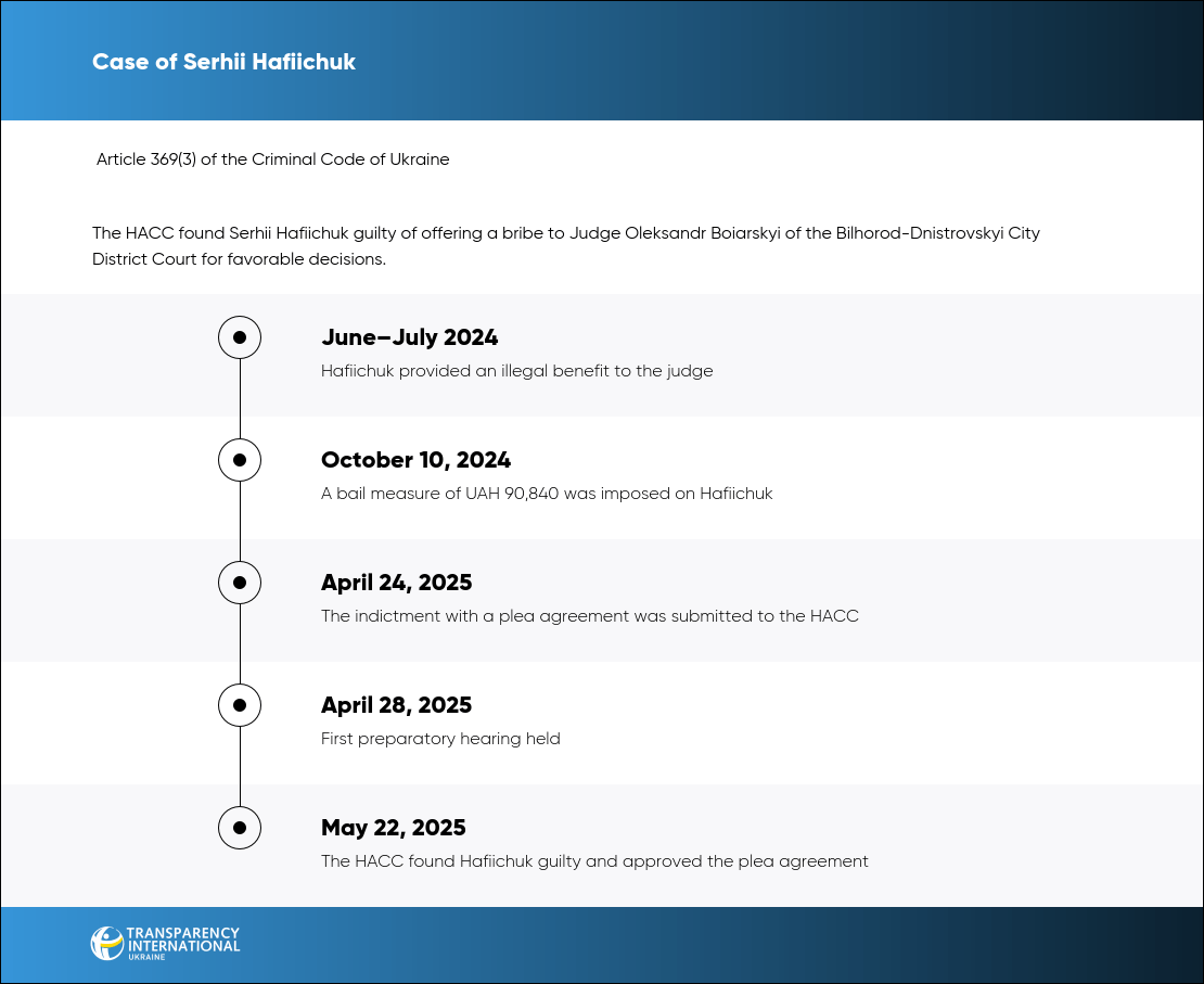 The HACC has found Serhii Hafiichuk guilty of offering a bribe to Oleksandr Boiarskyi, a judge of the Bilhorod-Dnistrovskyi City District Court of Odesa Region.