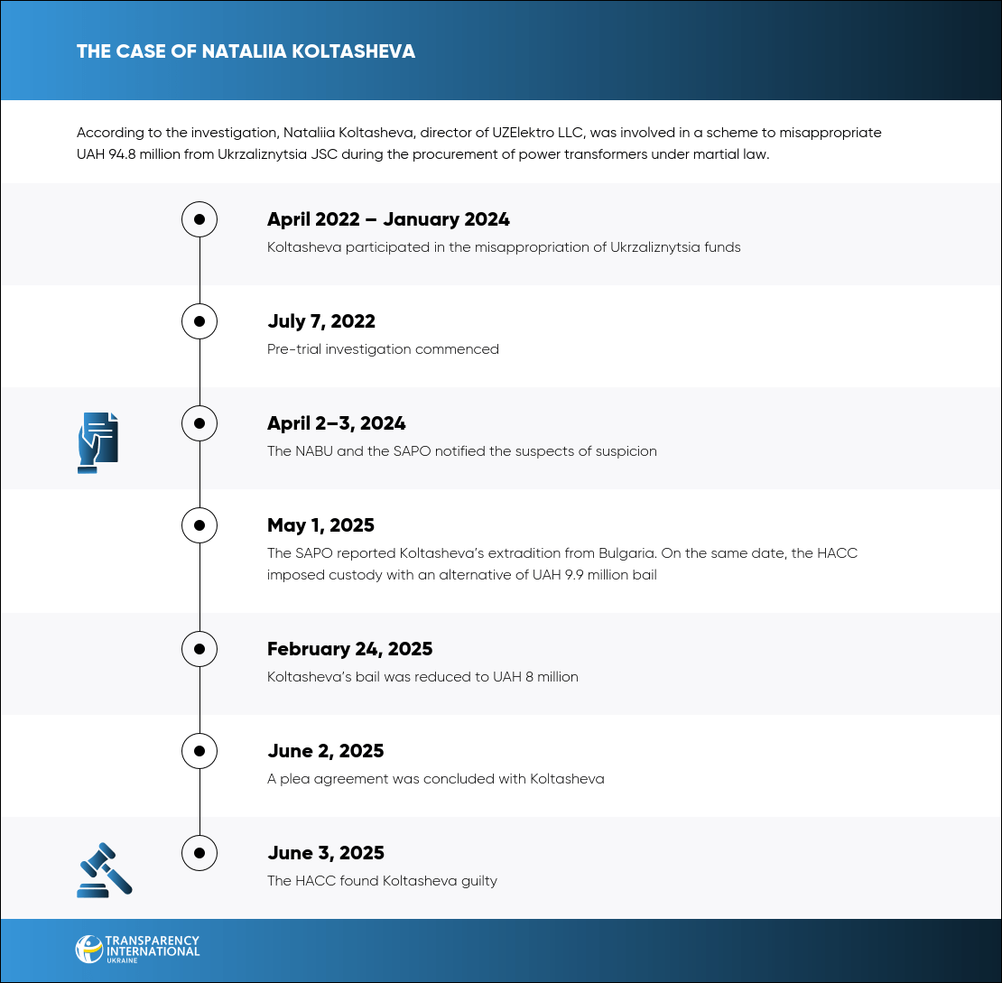 Koltasheva also agreed to compensate UAH 1 million in damages. In addition, the court ordered the special confiscation of UAH 54.6 million held in the accounts of UZElektro LLC.