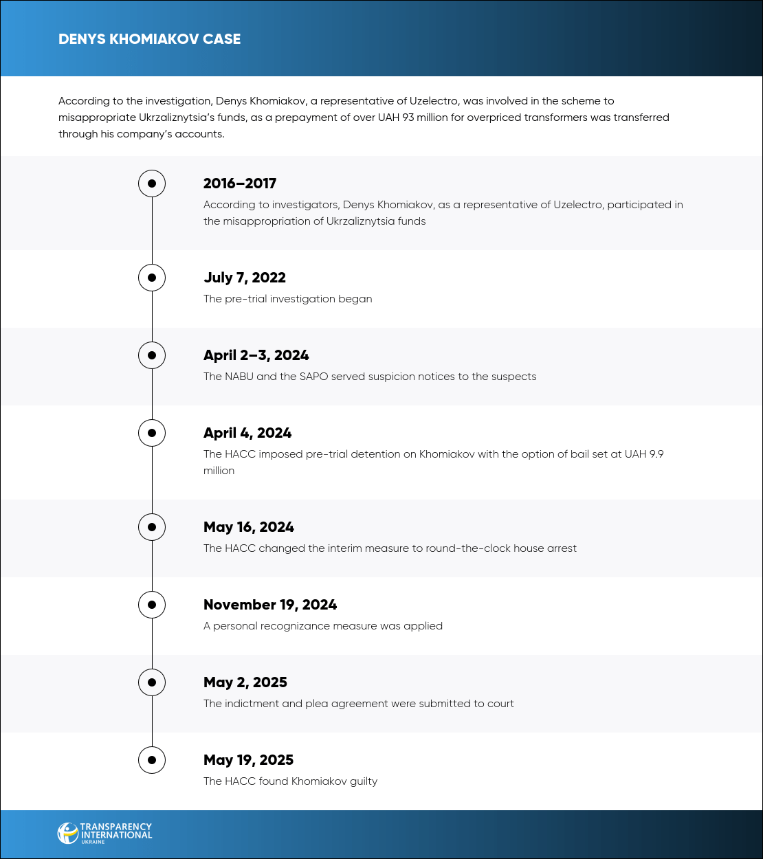 The HACC approved a plea agreement with Denys Khomiakov, a representative of the private company Uzelectro, in a case concerning the misappropriation of Ukrzaliznytsia funds.