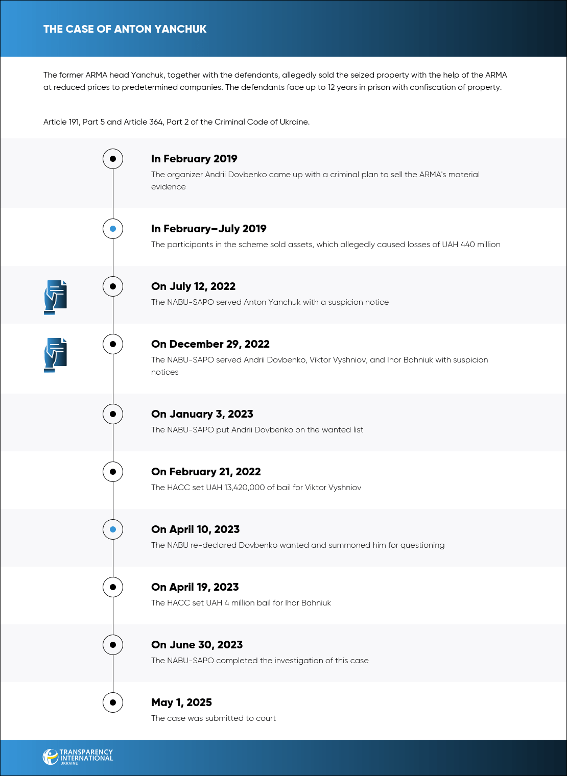 Yanchuk, on his part, allegedly lobbied the adoption of required regulations that created the illusion of legality of their manipulations with the seized property for the benefit of the criminal group. Dovbenko, according to investigators, ensured control over the ARMA's operation, from the transfer of the seized property to the ARMA to its actual sale.