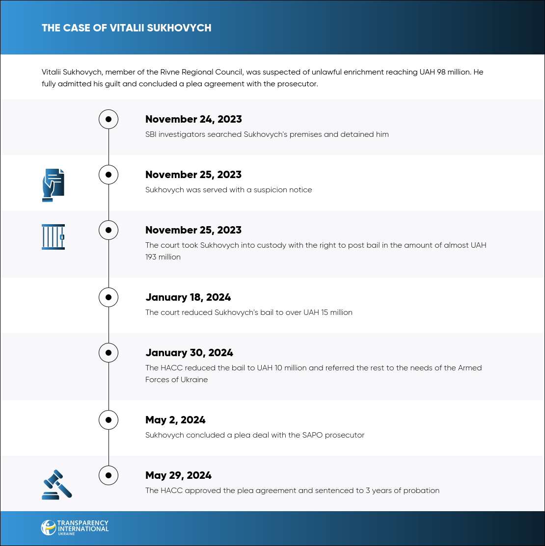 On May 29, 2024, the HACC found Vitalii Sukhovych, member of the Rivne Regional Council, guilty of unlawful enrichment. He pleaded guilty and concluded a deal with the prosecutor, so the court imposed a 3-year probationary period on him.