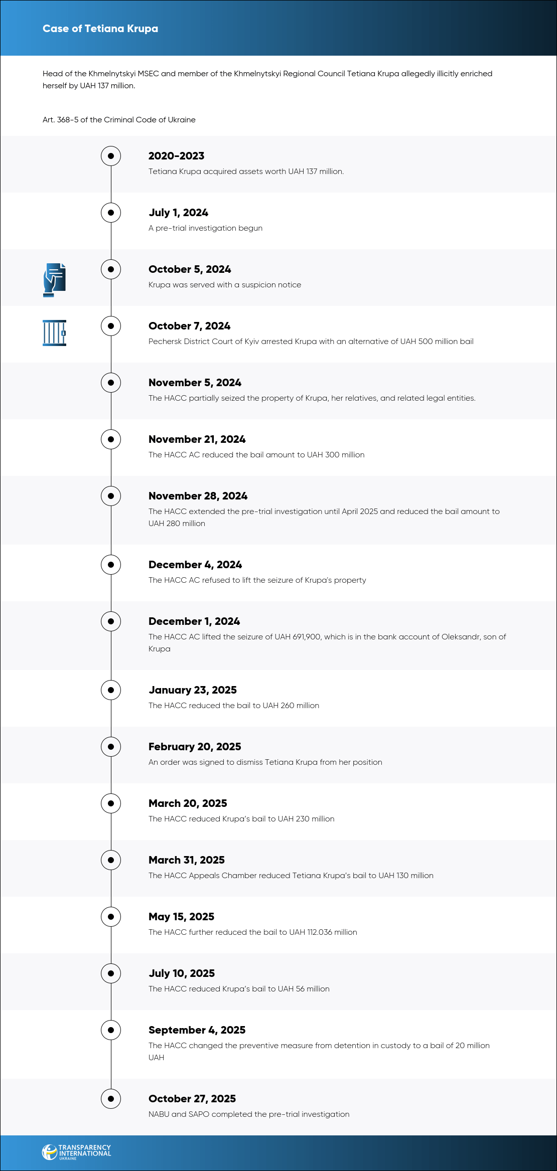 In April 2025, Polish law enforcement authorities also launched a case against Tetiana Krupa over the transfer of funds to Poland allegedly acquired through corruption. The money laundering case has been merged with the Ukrainian investigation into the family's illicit enrichment.
