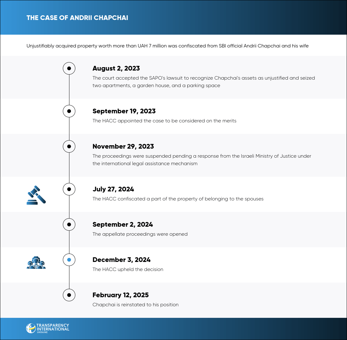 The HACC found some of the assets to be unjustified: the apartment for UAH 3.8 million, the parking space for UAH 700,000 registered to Apolonina's aunt, and a portion of the cost of another apartment — UAH 2.5 million out of a total of UAH 2.8 million. However, the court agreed that some of the funds for the apartment registered to the aunt were paid with Chapchai's official income, so they only confiscated a portion of its value. The court also found that the garden house was built with legally obtained funds.