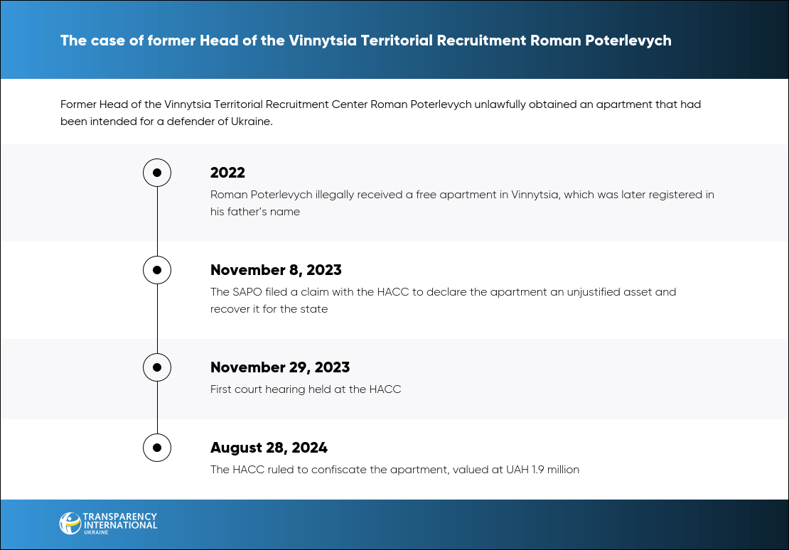 An apartment unlawfully acquired by former Head of the Vinnytsia Territorial Recruitment and Social Support Center Roman Poterlevych was confiscated, as it had originally been intended for a defender of Ukraine.