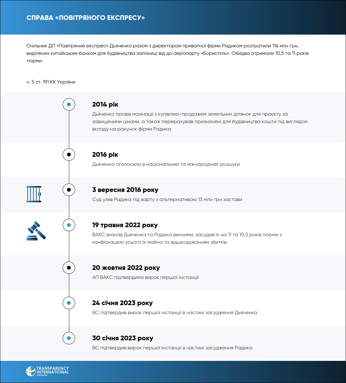 19 травня 2022 року ВАКС визнав винними керівника ДП «Повітряний експрес» Геннадія Дьяченка та директора приватної фірми Івана Радика, які разом заволоділи 116 млн грн, призначеними для будівництва залізничного сполучення між Києвом та аеропортом «Бориспіль». Їх засудили на 10,5 та 11 років позбавлення волі.