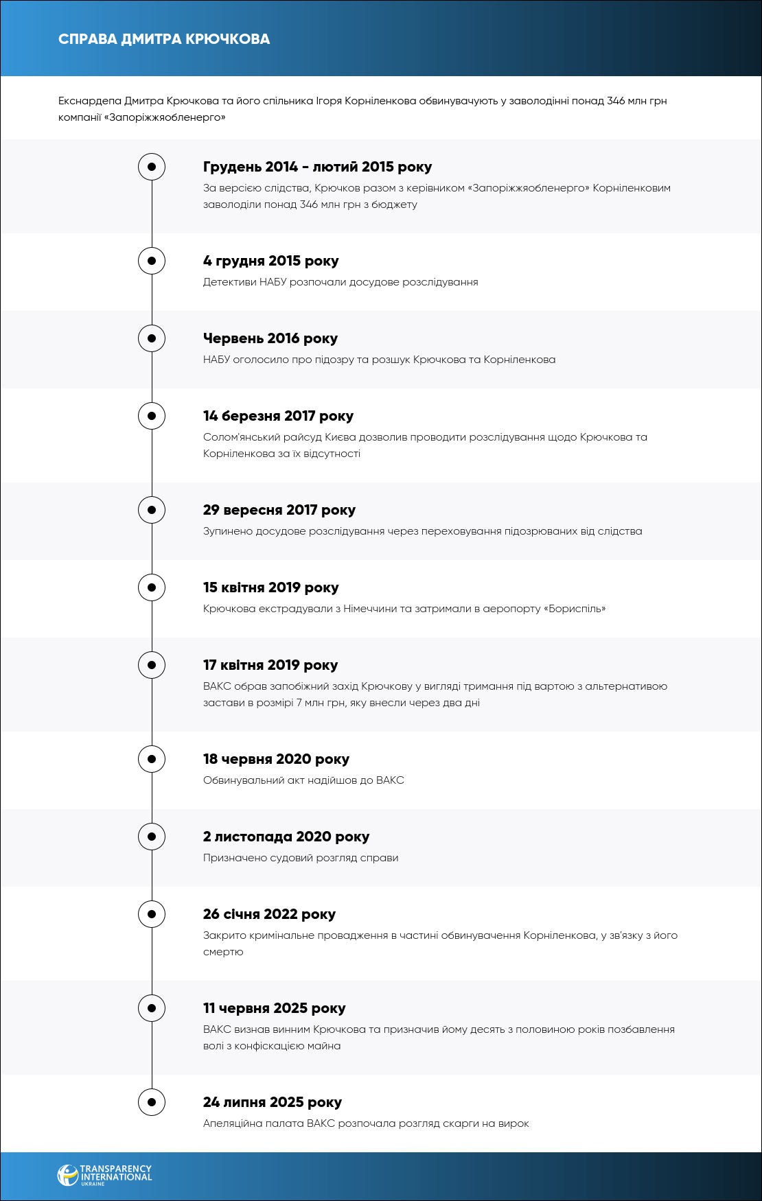 За версією обвинувачення, у період з грудня 2014 року по лютий 2015 року екснардеп Дмитро Крючков, перебуваючи на посаді голови правління ПрАТ «ХК «Енергомережа», організував схему, яка дозволила цій компанії незаконно заволодіти коштами, що мали надійти державному підприємству ПАТ «Запоріжжяобленерго». У змові з керівником обленерго Ігорем Корніленковим вони уклали п’ять договорів про відступлення на користь «Енергомережі» права вимоги заборгованості з великими споживачами електроенергії, а саме ДП «Запорізький титано-магнієвий комбінат», ТОВ «Запорізький титано-магнієвий комбінат» та ПАТ «Дніпроспецсталь».