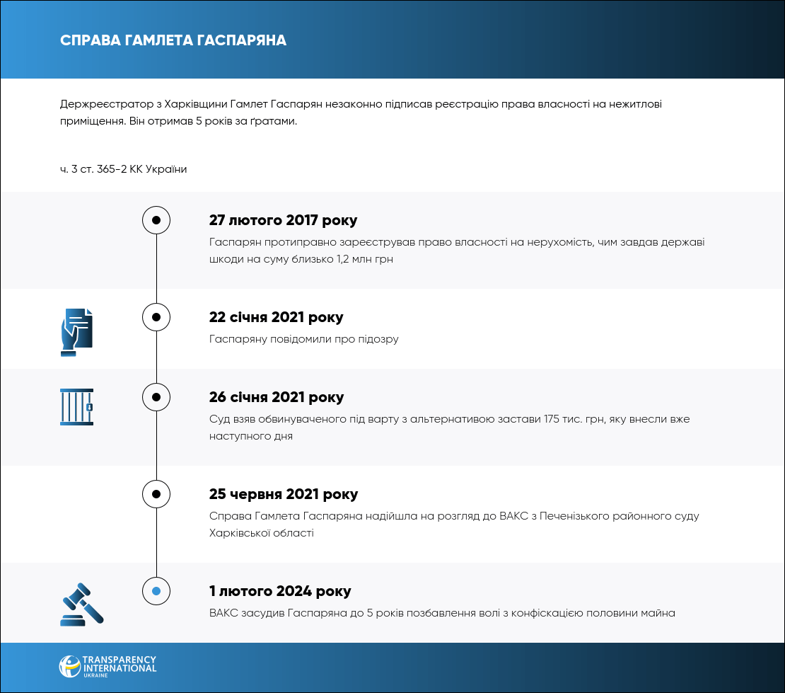 1 лютого 2024 року ВАКС визнав винним держреєстратора на Харківщині Гамлета Гаспаряна у незаконній реєстрації права власності, що завдало державі 1,2 млн грн збитків. Він отримав 5 років в’язниці.