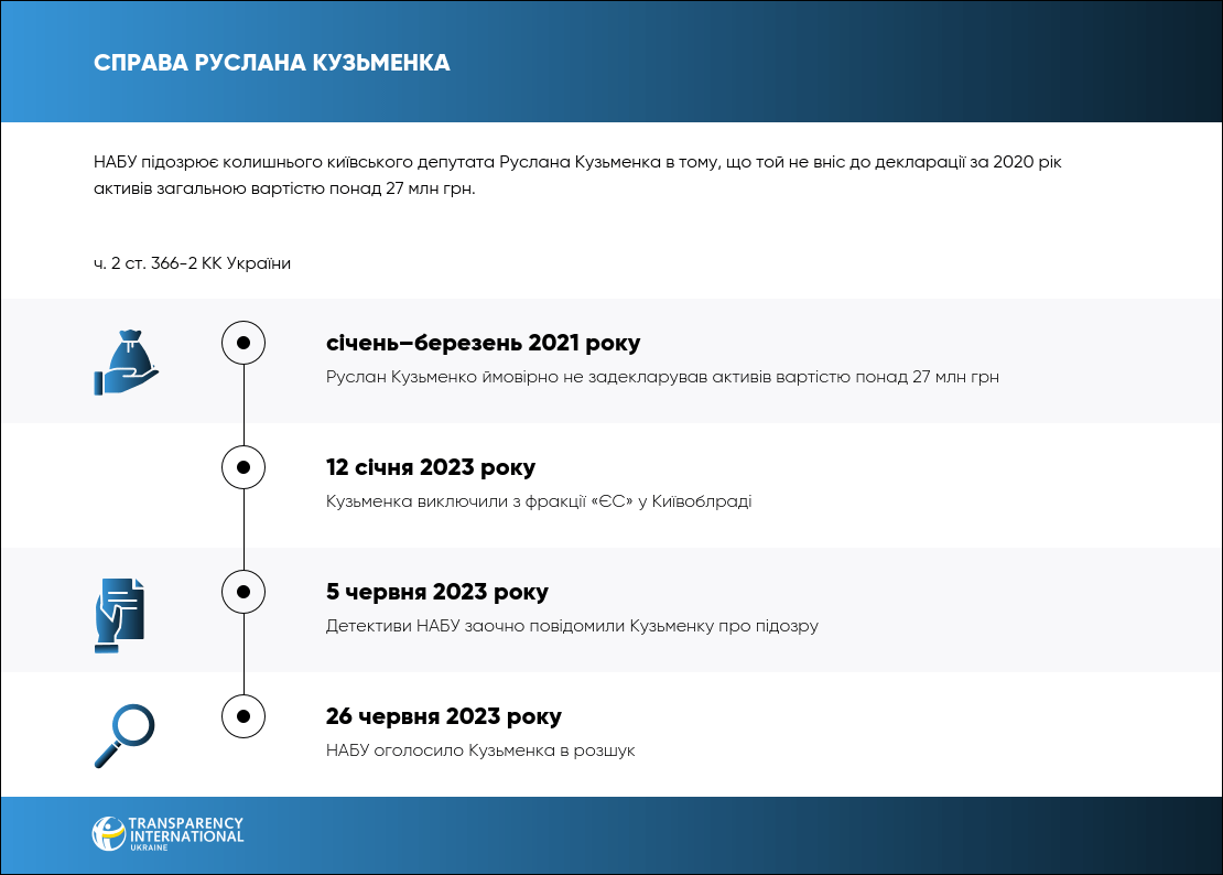НАБУ підозрює колишнього київського депутата Руслана Кузьменка в тому, що той не вніс до декларації активів загальною вартістю понад 27 млн грн. Він перебуває у розшуку.